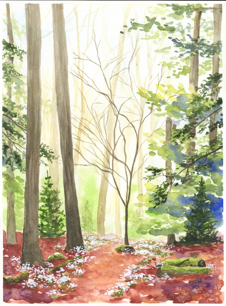 This was painted from a photograph I took over 5 years ago. It was taken during a hiking trip to Jack’s Mountain, PA. It holds a lot of meaning and memory for me. It was one of my dad’s favorite things to do – to hike in the woods. Though it holds treasure and beauty it also holds memory that is tainted by tragedy. By loss. By grief. At the time of painting this, it was nearly 5 years since my dad’s death.